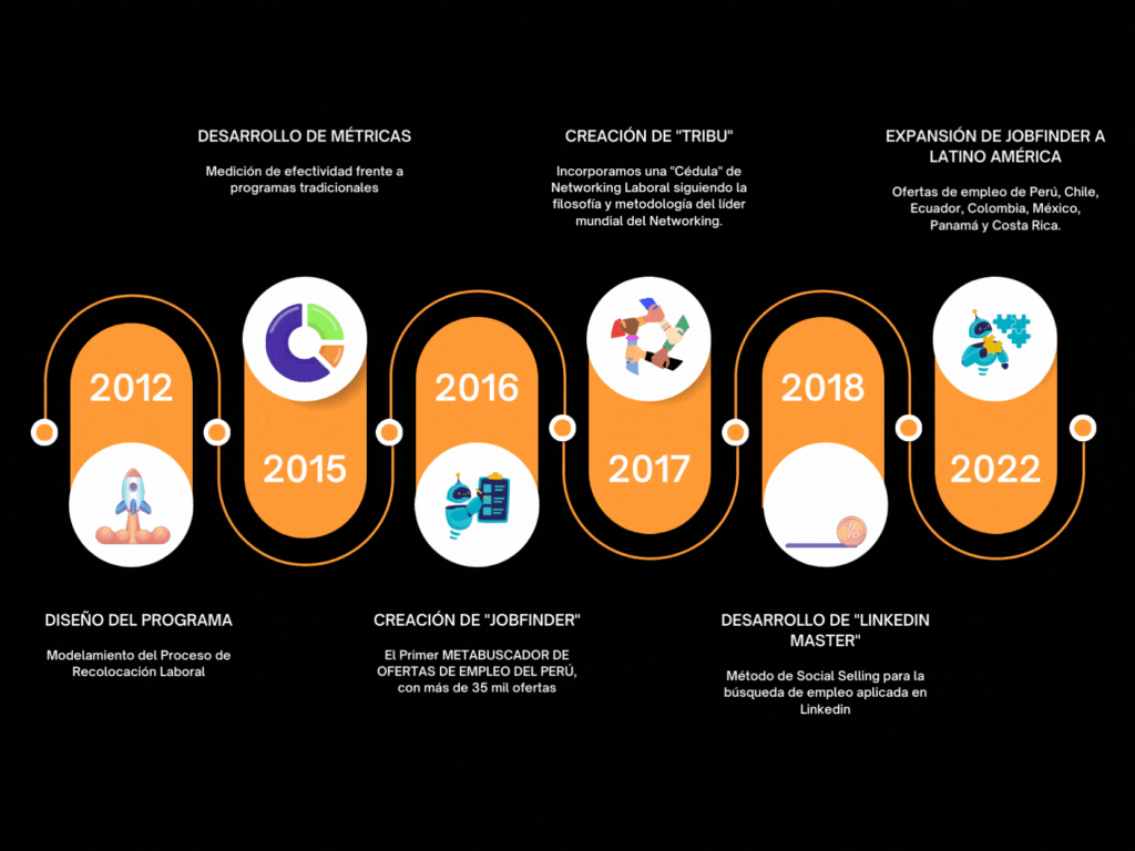Somos una firma peruana líder en Programas de Recolocación Laboral y Desarrollo Profesional. Ofrecemos los programas más completos y efectivos de Outplacement, respaldados por herramientas poderosas, metodologías y técnicas únicas, un enfoque rigurosamente estructurado y tecnología propia e innovadora para conseguir tu próximo empleo. Lo mejor de todo es que hemos mejorado los Programas Tradicionales de Outplacement con innovación metodológica y tecnológica, lo que nos permite adaptarnos a diversos escenarios y garantizar la efectividad de nuestros procesos aplicados.